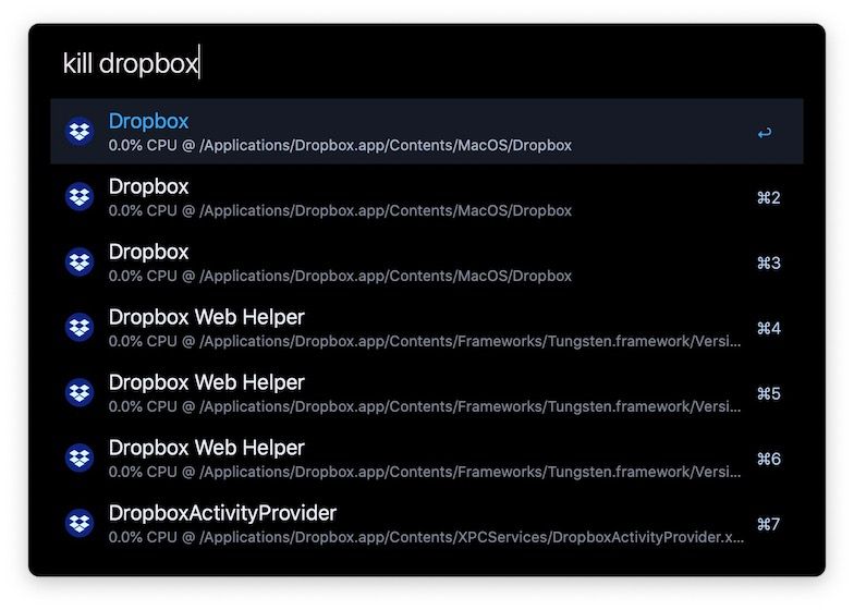 킬 프로세스(Kill Process)는 백그라운드에서 실행되는 프로세스를 제거할 수 있는 편리한 알프레드 워크플로우입니다.