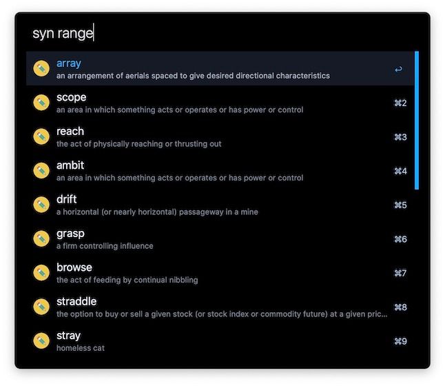 우리가 글을 쓸 때, 때때로 우리는 단어의 동의어나 반의어를 찾을 필요가 있습니다. 이 워크플로우는 알프레드 창에서 찾을 수 있도록 합니다. 반의어와 동의어를 찾는 것 외에도, 여러분은 다른 단어를 설명하는 운율 단어와 단어를 찾는 데 그것을 사용할 수 있습니다.