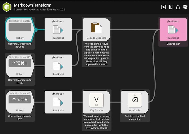 이것은 마크다운 작성자에게 유용한 알프레드 작업 흐름입니다. 선택한 마크다운 텍스트를 다른 형식으로 변환하기만 하면 됩니다. 지원되는 출력 형식에는 RTF, HTML 및 BBC 코드가 포함됩니다. 이러한 출력 형식에 대해 다른 바로 가기 키를 설정할 수 있습니다. 이 프로그램을 사용하려면 마크다운 텍스트를 선택하고 바로 가기 키를 누릅니다. 서식 있는 텍스트를 클립보드에 복사합니다. 예전처럼 많이 쓰지는 않지만, 급할 때마다 유용하게 쓰입니다.