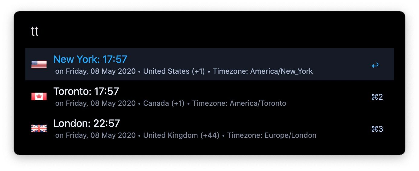 TimeZones는 정기적으로 작업하거나 다른 시간대에 가족이 있는 사용자에게 유용한 워크플로우입니다. 감시할 장소의 목록을 작성할 수 있습니다. 시계를 24시간 또는 12시간으로 설정할 수 있습니다. 목록에서 플레이스를 추가하거나 제거할 수 있습니다. 모든 것이 Alfred 창에서 일어나며 코드나 워크플로우 단계를 거치지 않아도 됩니다.