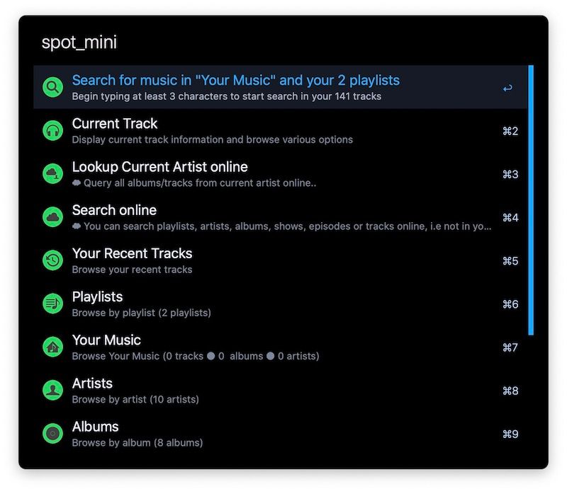 알프레드 워크플로우의 진정한 힘을 보려면 Spotify 미니 플레이어를 다운로드해야 합니다. 이 워크플로우를 사용하면 알프레드의 Spotify를 제어할 수 있습니다. 노래 재생/일시 중지/건너뛰기, 재생 목록 선택, 재생 목록 내의 노래 검색, 라이브러리에 없는 노래 검색, 노래 가사 열기 등을 할 수 있습니다. 노래 검색 속도가 빠르고, 스포티파이 앱을 사용하는 것보다 훨씬 낫습니다. 노래 외에도 팟캐스트를 검색하고 재생할 수 있습니다. 가장 좋은 점은 워크플로우가 유료 및 무료 Spotify 계정과 함께 작동합니다는 것입니다. 구독자일 필요는 없고 Spotify 계정만 있으면 됩니다.