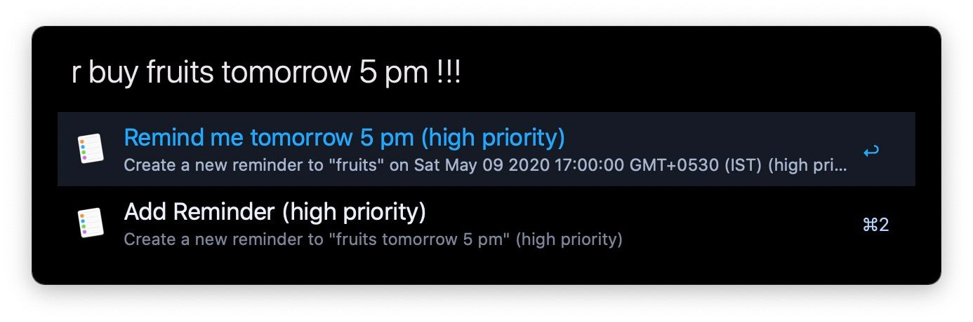 알림 워크플로우를 사용하여 Alfred를 사용하여 Apple 알림에 알림을 추가할 수 있습니다. 또한 이 워크플로우를 사용하여 미리 알림을 더 쉽게 추가할 수 있습니다. 목록을 선택하고 날짜 및 시간을 설정할 수 있습니다. 이것은 자연어 처리를 이용하기 때문에 여러분은 내일 오후 5시에 과일을 사는 것과 같은 것들을 타이핑할 수 있습니다. 그리고 그것은 같은 것을 상기시켜 줄 것입니다. "!"를 사용하여 미리 알림 우선 순위를 설정할 수 있습니다. 낮은 경우에는!, 중간에는!!!를 사용합니다. 우선 순위를 정합니다.