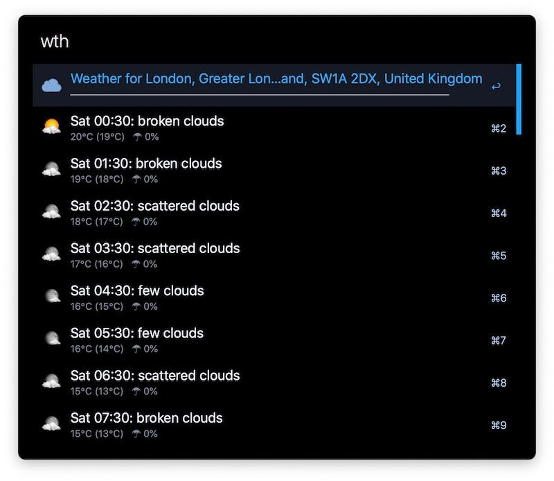 알프레드가 스포트라이트보다 낫기는 하지만, 날씨를 알려주는 것과 같이 할 수 없는 것들이 있습니다. 먼저 설치해야 할 워크플로우는 날씨 워크플로우 입니다. 워크플로우를 통해 위치의 시간별 및 일별 일기 예보를 볼 수 있습니다. 또한 세계 어느 지역의 날씨 데이터도 검색할 수 있습니다. 워크플로우를 통해 원하는 날씨 예보 API를 선택할 수 있습니다.