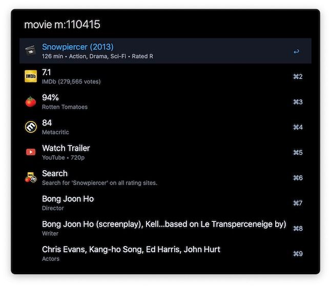 A Workflow for the OS X app Alfred: Search for movies and tv shows to find ratings from a few sites.