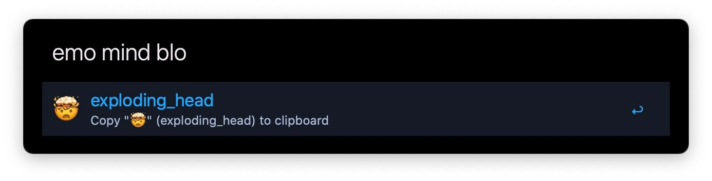 Search for emoji and copy them to the clipboard ?. Download v1.8.1 (2019-09-27) Usage: emoji [query] Press [return] (↵): Copy the symbol of the selected emoji (e.g. ?) to your clipboard. Press [alt]+[return] (⌥↵): Copy the code of the selected emoji