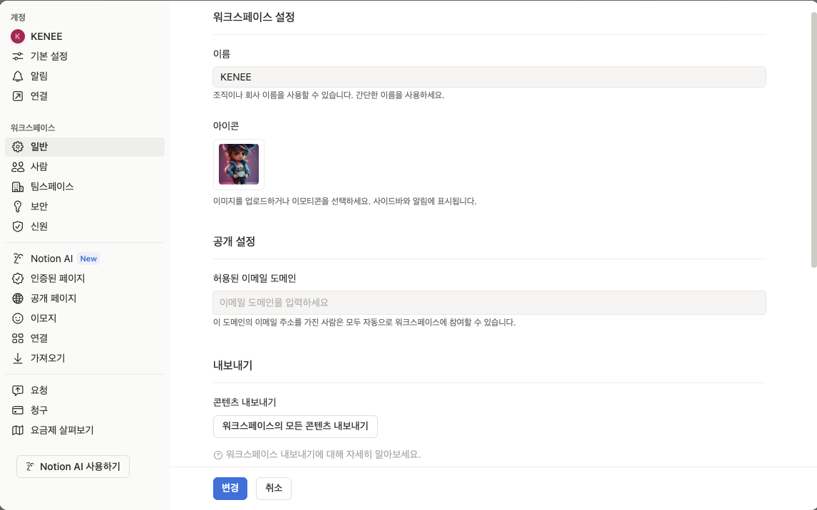 1. 노션 좌측 상단의 워크스페이스 이름 클릭