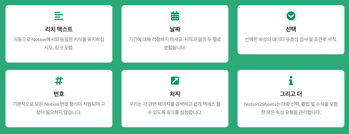 Notion2Sheets를 사용하면 Notion의 데이터베이스를 Google 스프레드 시트와 자동으로 동기화 할 수 있습니다.