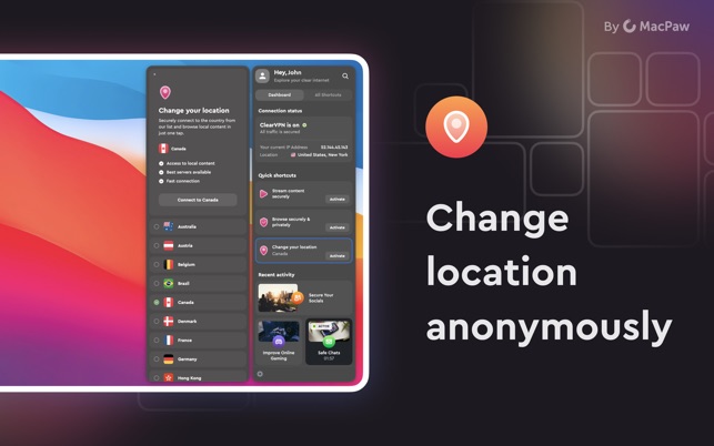 맥에서 사용할 수 있는 VPN 클라이언트는 매우 다양하지만 클리어VPN(ClearVPN)만큼 직관적이고 쓰기 편한 것은 찾기 힘들다. 복잡한 서버 목록 중 하나를 선택하는 대신, 사용자가 하려는 작업이나 프라이빗 브라우징인지 혹은 미국 이외 지역에서 넷플릭스를 보려는 건지 등을 자동으로 감지해 최적의 네트워크에 연결해 준다. 맥퍼(MacPaw)의 실시간 다이내믹 플로우(Dynamic Flow) 기술을 이용해 프로토콜이나 서버, 암호화 등 모든 것을 백그라운드에서 처리해 사용자의 요구에 맞는 최적의 서버를 선택한다. 사용량이 많다면 월 13달러를 내고 구독하는 것이 좋지만, 무료 서비스도 넷플릭스 스트리밍, 광고 없는 브라우징 등 일부 단축키를 지원해 충분히 맥에서 사용할만하다.