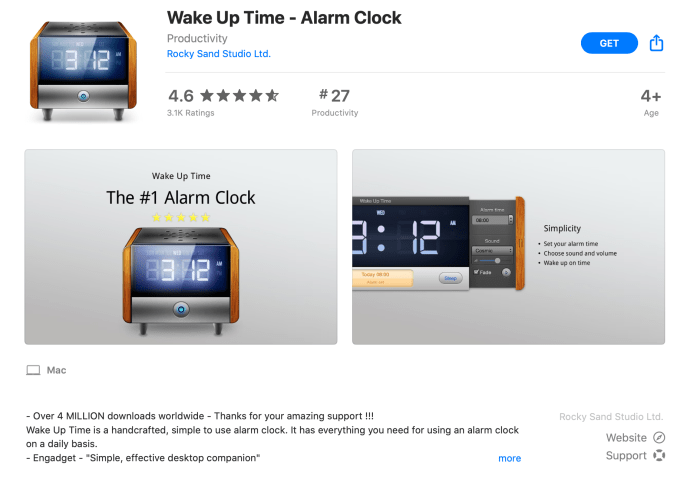 맥에서 시계 앱 없이 알람을 설정하기는 쉽지 않다. 아이폰과 비교하면 더 그렇다. 이때 유용한 것이 '웨이크 업 타임(Wake Up Time)'이다. 외형은 마치 모던 클록 라디오처럼 보이는 스큐오모픽(skeuomorphic) 디자인이다. 알람을 정할 시간과, 암탉과 암소 소리를 포함한 8개 소리 중 하나를 선택하면 된다. 알람음으로 좋아하는 음악을 설정할 수도 있다. 헬퍼 앱도 다운로드할 수 있는데, 이를 이용하면 맥이 알람 시간까지 잠자기 모드로 있도록 설정할 수 있다.