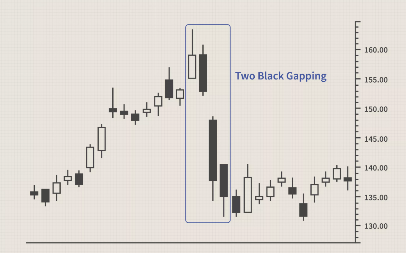 두 개의 검은 막대가 더 낮은 수치를 기록하는 격차로 인해 약세를 보이는 두 개의 검은 막대가 눈에 띄는 상승세를 보인 후에 약세를 보이는 연속 패턴이 나타납니다. 이러한 패턴은 하락폭이 더욱 더 낮아질 것으로 예측하며, 아마도 더 광범위한 하락세를 촉발할 것입니다. Bulkowski에 따르면, 이 패턴은 68%의 정확도로 더 낮은 가격을 예측합니다.