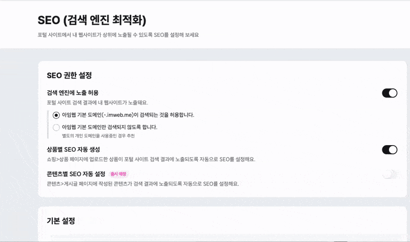 검색엔진에서 잘 노출되기 위해선 초기 SEO 설정이 중요합니다. 아이엠웹은 직관적인 SEO 패널을 제공하여 누구나 쉽게 설정할 수 있습니다.
