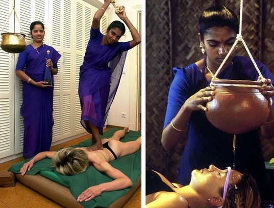 따뜻하게 데운 오일을 이마에 떨어뜨리며 몸의 균형을 맞춰주는 기법이며 근육을 풀어주기보단 가볍게 밀며 오일과 기타 재료로 하는 마사지기 때문에 통닭이 되는 경험이라고 표현하기도 하지만 아유르베다는 인도의 전통 의학의 한 분야로 병원에서 치료용으로도 처방되는 마사지랍니다.